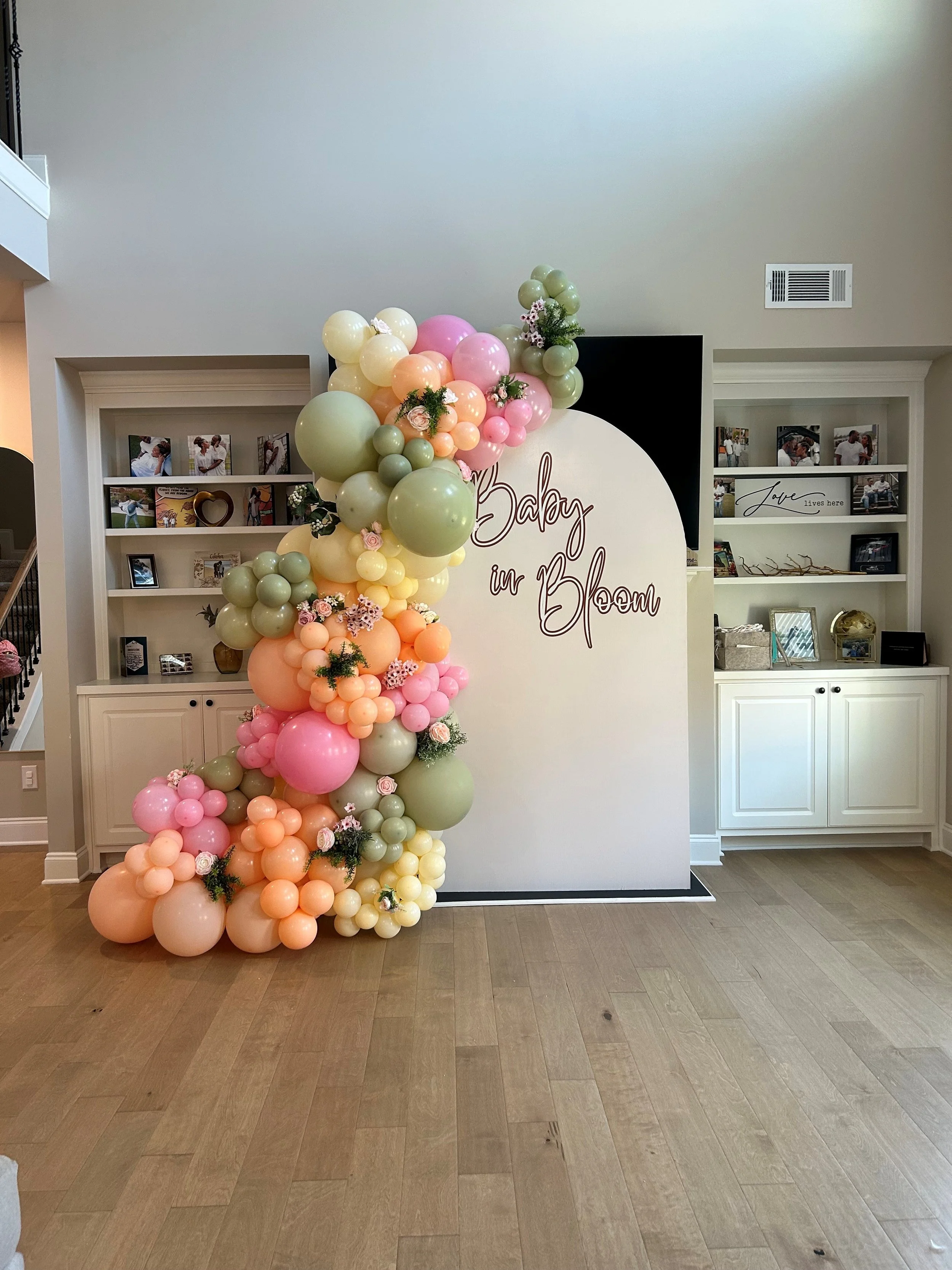 Vinyl 8X8ft backdrop + 14ft balloon garland + Shoe box prop $850